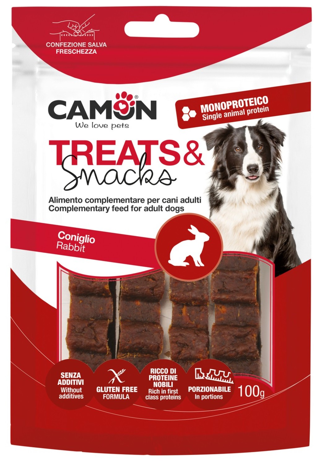SLOŽENÍ: králičí maso 82 %, sójový proteinový koncentrát, kukuřičný škrob, sorbitol, (rostlinný) glycerin, chlorid sodný.